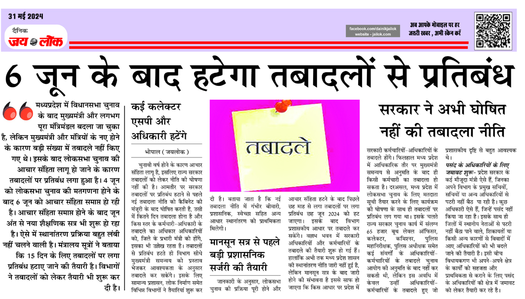 6 जून के बाद हटेगा तबादलों से प्रतिबंध : कई कलेक्टर एसपी और अधिकारी हटेंगे