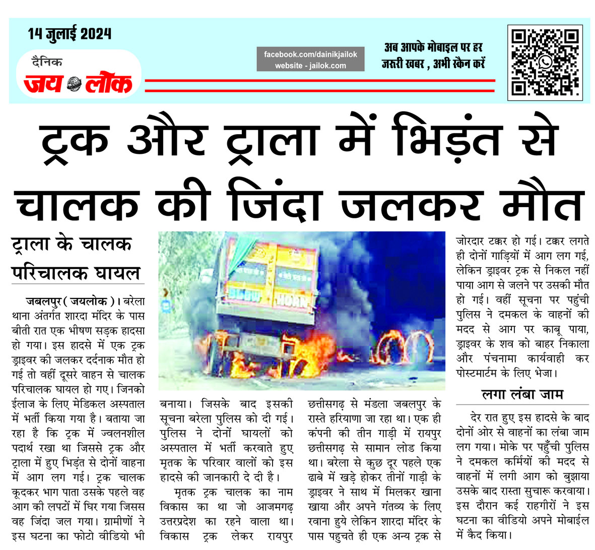 ट्रक और ट्राला में भिड़ंत से चालक की जिंदा जलकर मौत : ट्राला के चालक परिचालक घायल