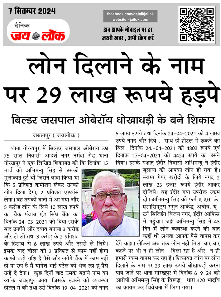 लोन दिलाने के नाम पर 29 लाख रूपये हड़पे: बिल्डर जसपाल ओबेरॉय धोखाधड़ी के बने शिकार