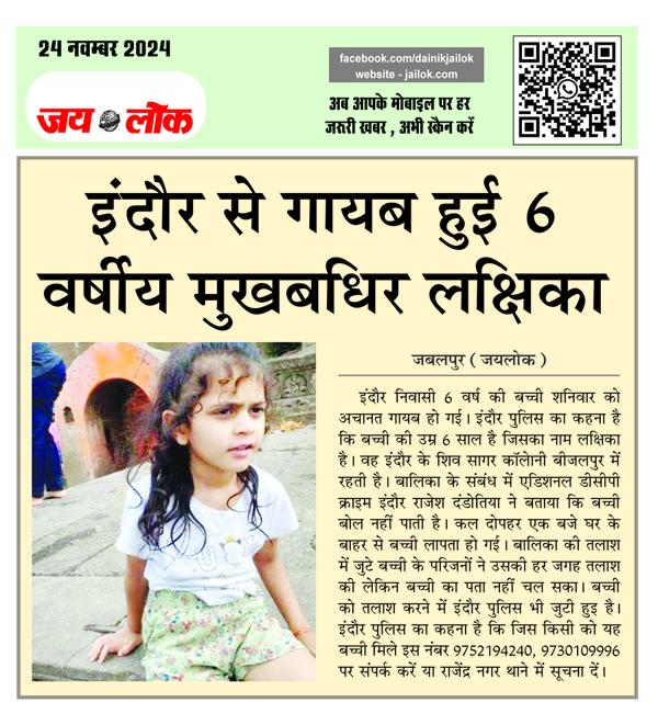 इंदौर से गायब हुई 6 वर्षीय मुखबधिर लक्षिका