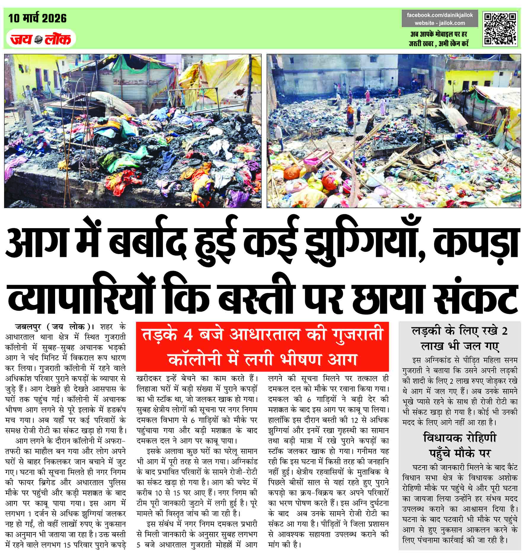 तडक़े 4 बजे आधारताल की गुजराती कॉलोनी में लगी भीषण आग जबलपुर (जय लोक)। शहर के आधारताल थाना क्षेत्र में