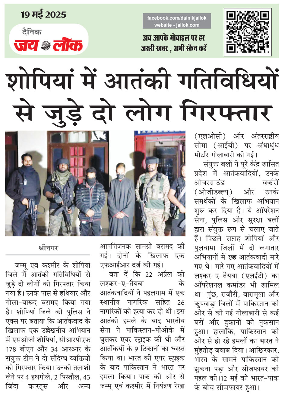शोपियां में आतंकी गतिविधियों से जुड़े दो लोग गिरफ्तार