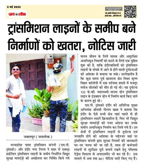 ट्रांसमिशन लाइनों के समीप बने निर्माणों को खतरा, नोटिस जारी