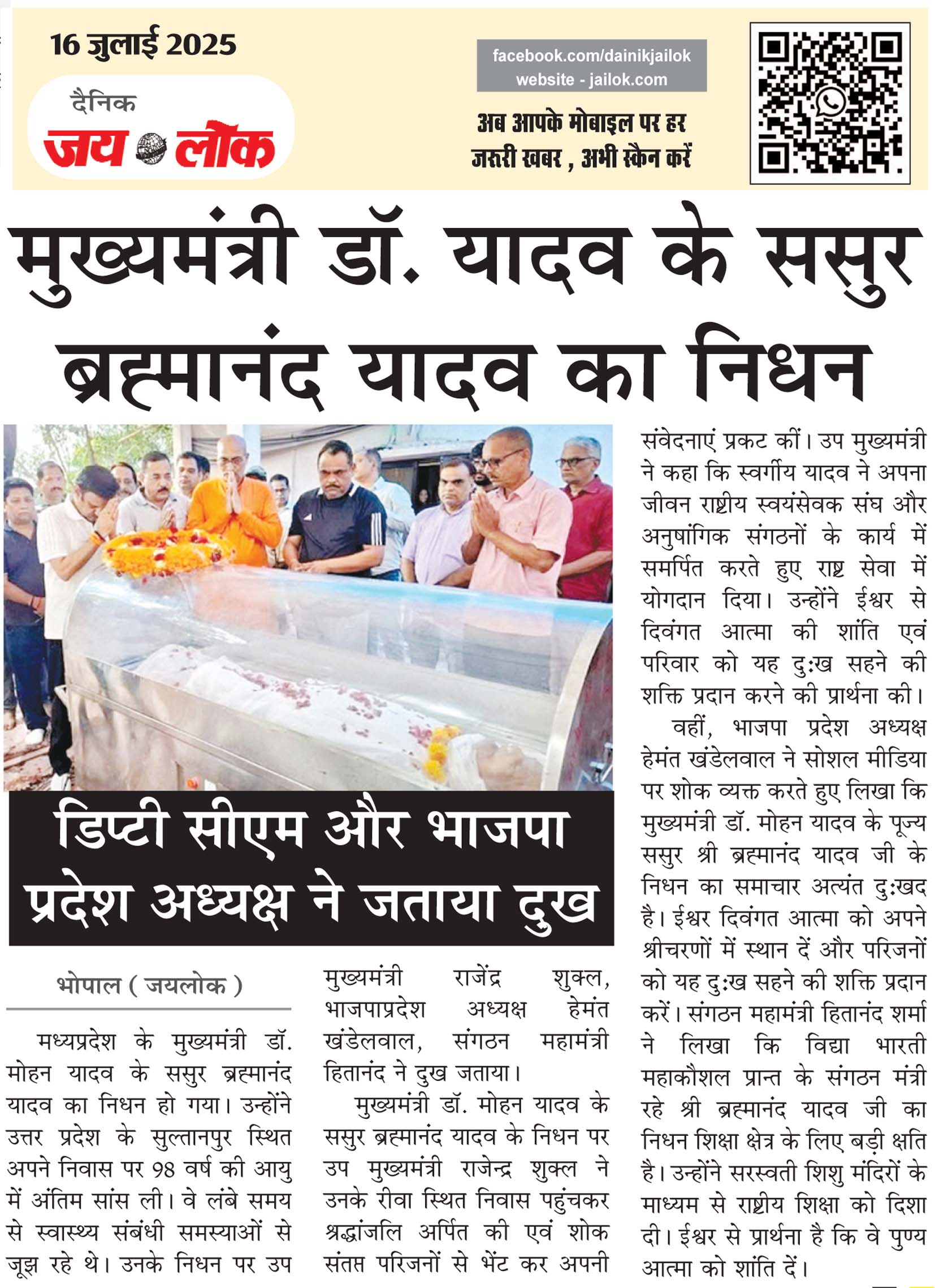 मुख्यमंत्री डॉ. यादव के ससुर ब्रह्मानंद यादव का निधन