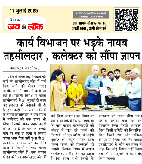 कार्य विभाजन पर भडक़े नायब तहसीलदार , कलेक्टर को सौंपा ज्ञापन