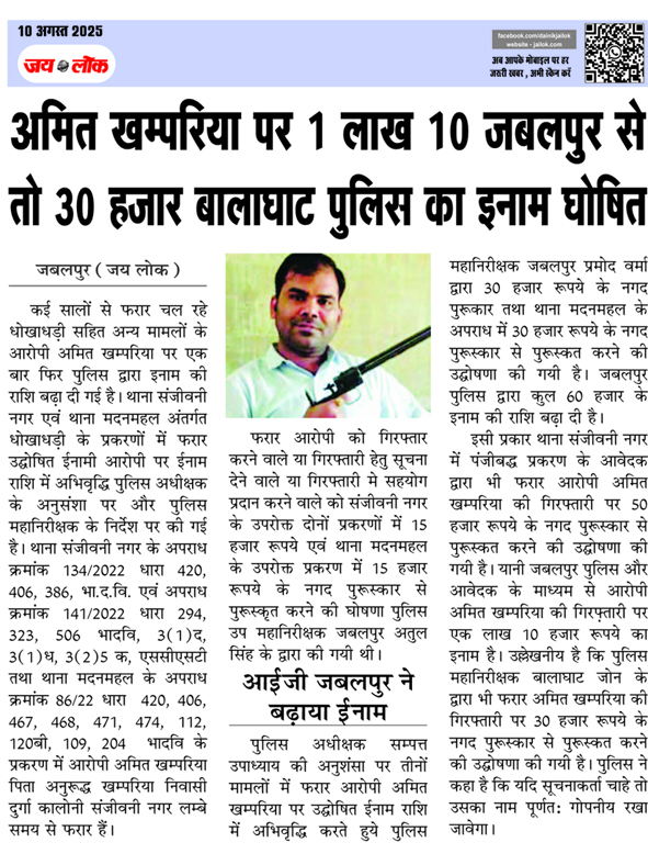 अमित खम्परिया पर 1 लाख 10 जबलपुर से तो 30 हजार बालाघाट पुलिस का इनाम घोषित
