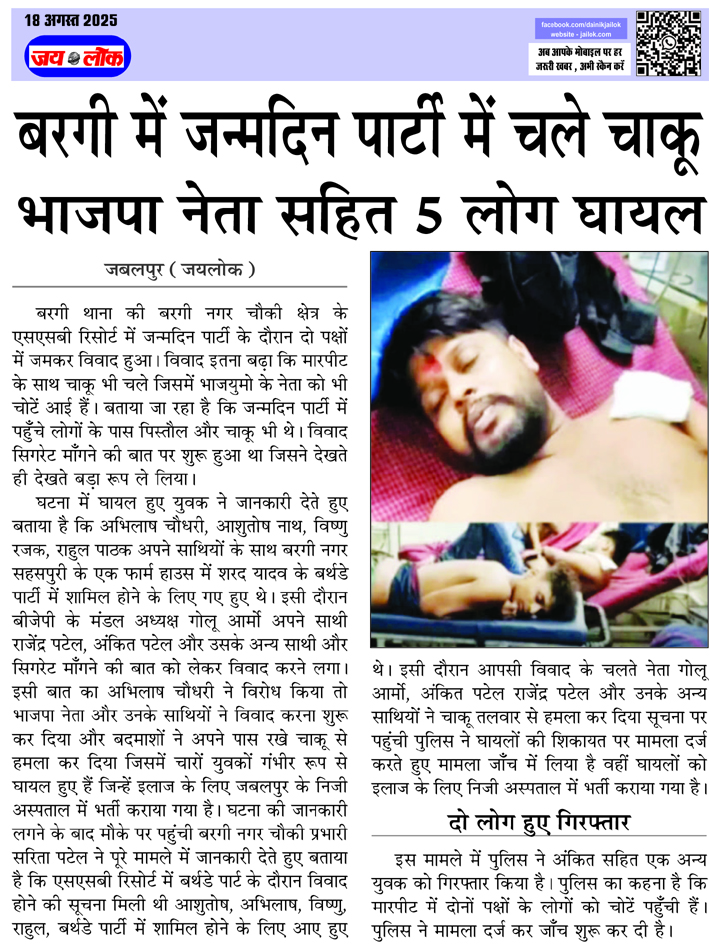 बरगी में जन्मदिन पार्टी में चले चाकू भाजपा नेता सहित 5 लोग घायल