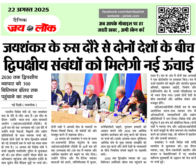 जयशंकर के रुस दौरे से दोनों देशों के बीच द्विपक्षीय संबंधों को मिलेगी नई ऊंचाई