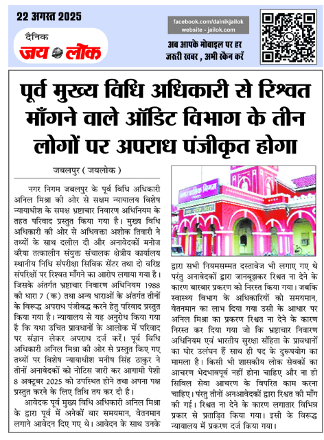 पूर्व मुख्य विधि अधिकारी से रिश्वत माँगने वाले ऑडिट विभाग के तीन लोगों पर अपराध पंजीकृत होगा