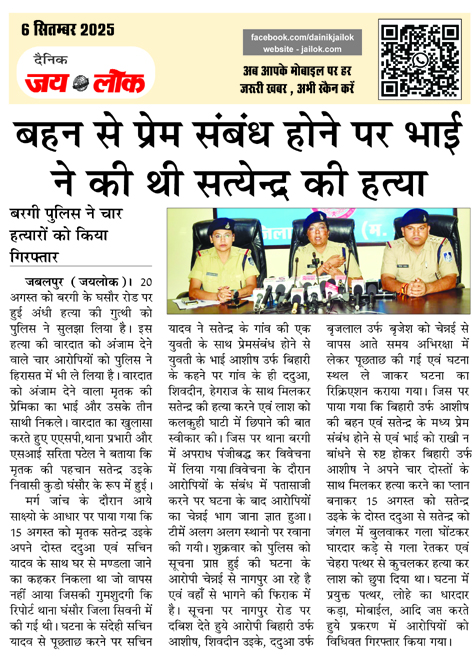 बहन से प्रेम संबंध होने पर भाई ने की थी सत्येन्द्र की हत्या, बरगी पुलिस ने चार हत्यारों को किया गिरफ्तार