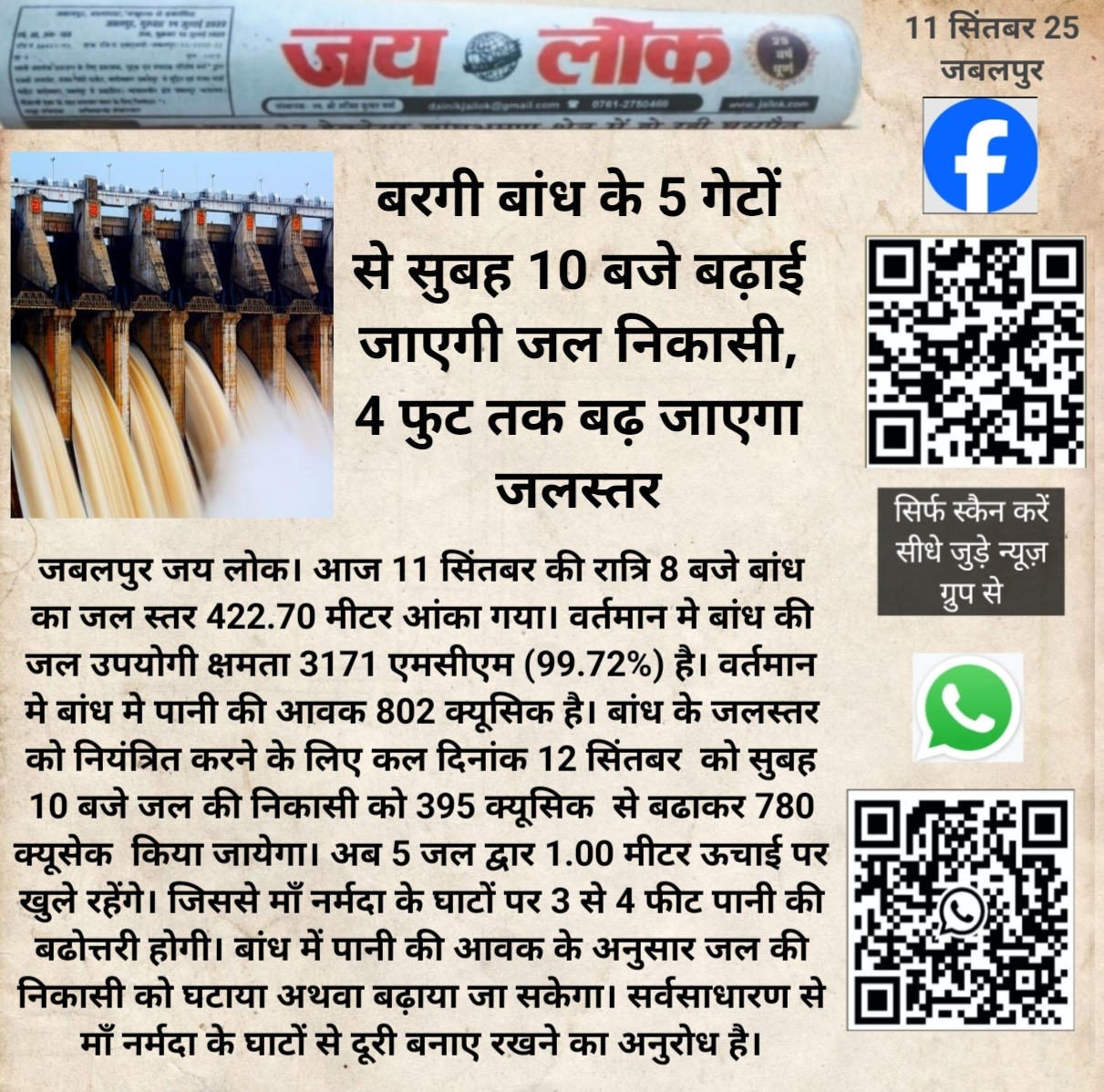 बरगी बांध के 5 गेटों से सुबह 10 बजे बढ़ाई जाएगी जल निकासी, 4 फुट तक बढ़ जाएगा जलस्तर