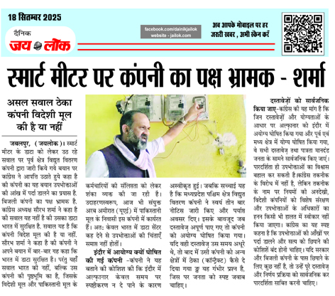 स्मार्ट मीटर पर कंपनी का पक्ष भ्रामक – शर्मा, असल सवाल ठेका कंपनी विदेशी मूल की है या नहीं