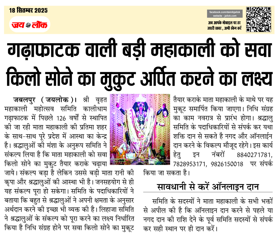 गढ़ाफाटक वाली बड़ी महाकाली को सवा किलो सोने का मुकुट अर्पित करने का लक्ष्य