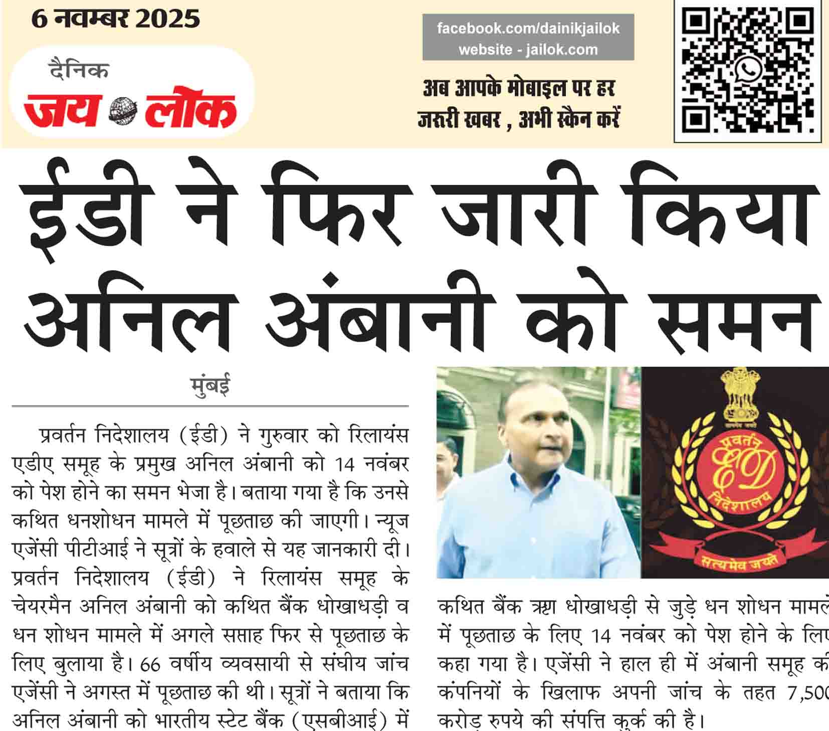 ईडी ने फिर जारी किया अनिल अंबानी को समन