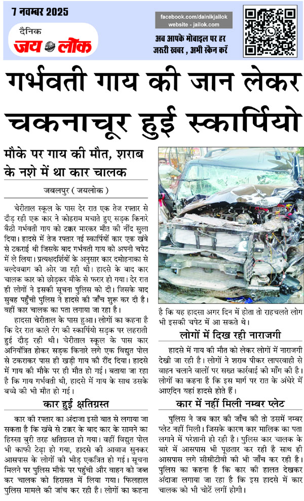 गर्भवती गाय की जान लेकर चकनाचूर हुई स्कार्पियो, मौके पर गाय की मौत, शराब के नशे में था कार चालक