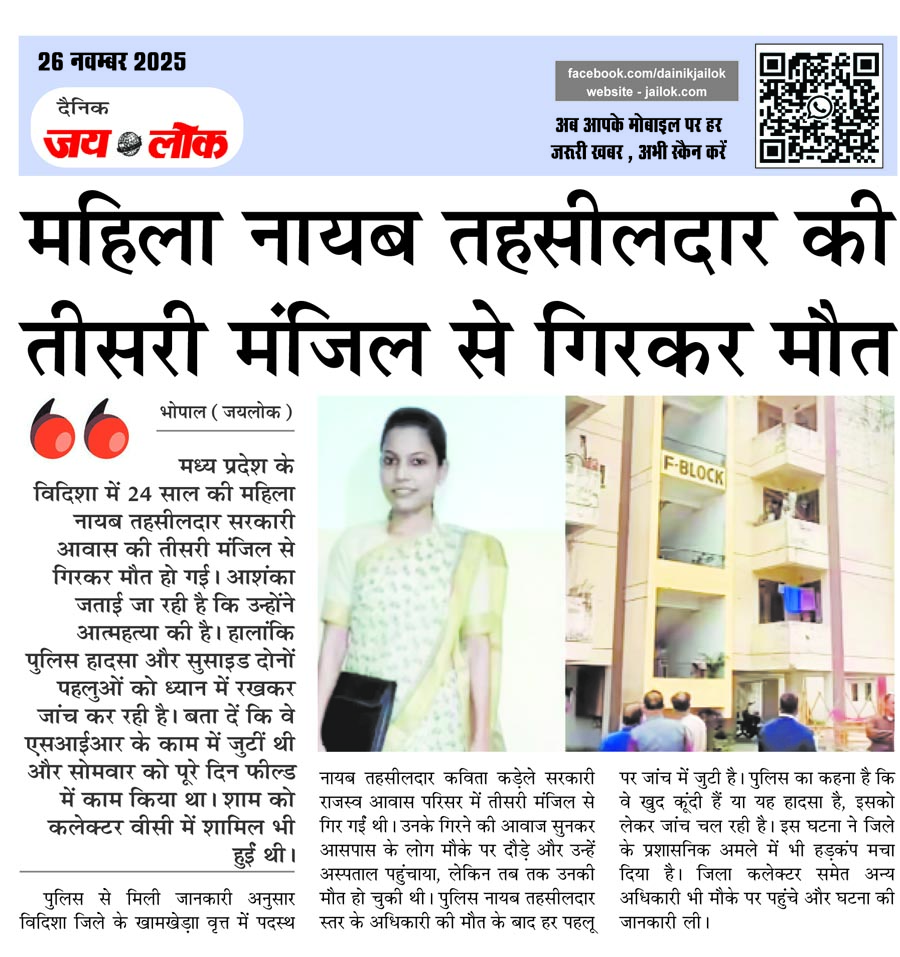 महिला नायब तहसीलदार की तीसरी मंजिल से गिरकर मौत