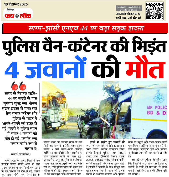 सागर-झांसी एनएच 44 पर बड़ा सडक़ हादसा, पुलिस वैन-कंटेनर की भिड़ंत, 4 जवानों की मौत
