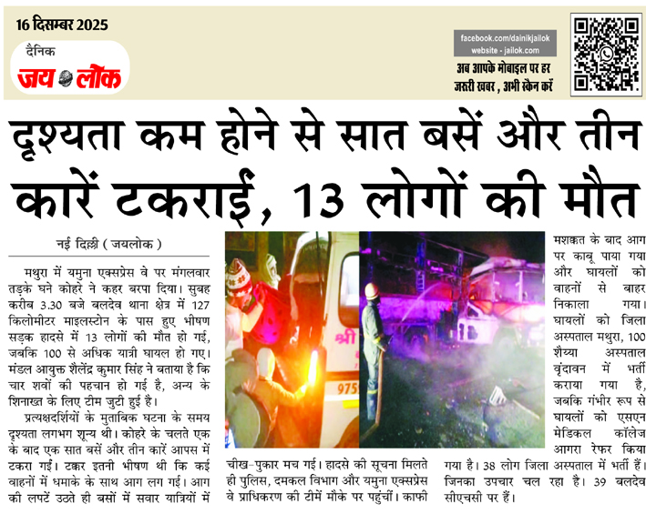 दृश्यता कम होने से सात बसें और तीन कारें टकराईं, 13 लोगों की मौत