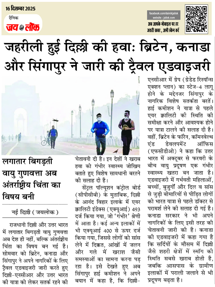 जहरीली हुई दिल्ली की हवा: ब्रिटेन, कनाडा और सिंगापुर ने जारी की ट्रैवल एडवाइजरी