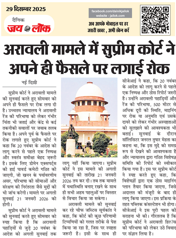 अरावली मामले में सुप्रीम कोर्ट ने अपने ही फैसले पर लगाई रोक