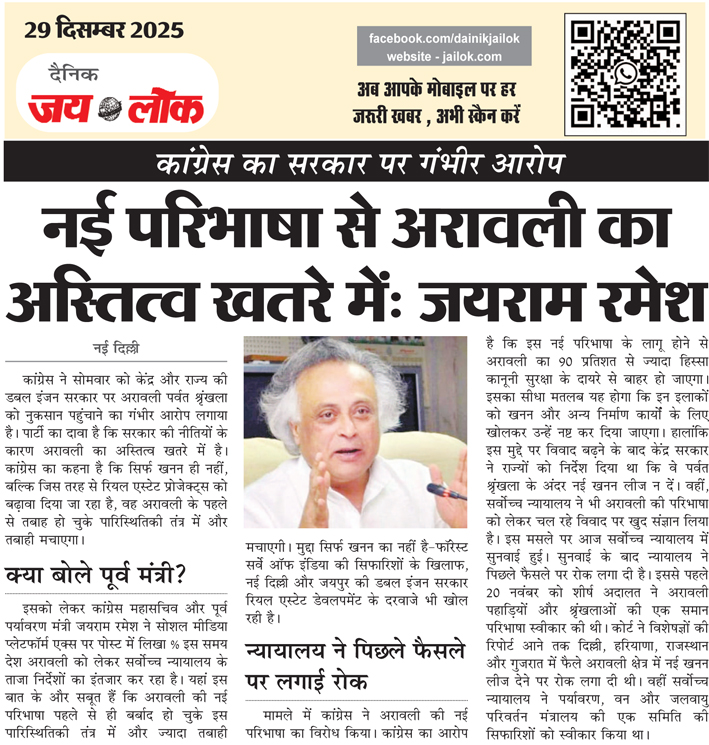 कांग्रेस का सरकार पर गंभीर आरोप, नई परिभाषा से अरावली का अस्तित्व खतरे में: जयराम रमेश