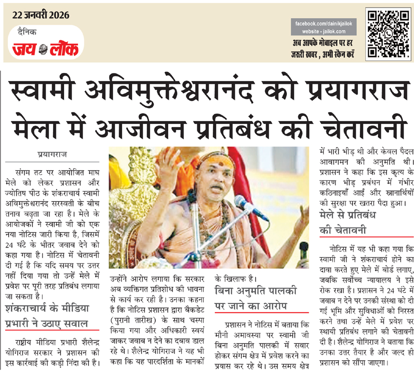 स्वामी अविमुक्तेश्वरानंद को प्रयागराज मेला में आजीवन प्रतिबंध की चेतावनी