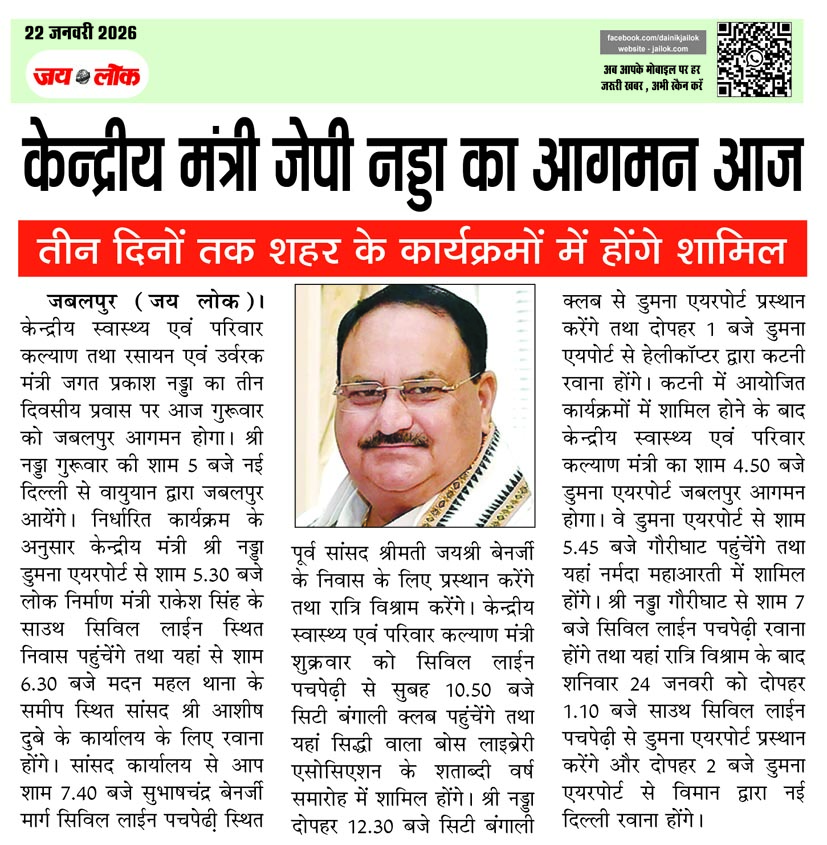 केन्द्रीय मंत्री जेपी नड्डा तीन दिनों तक शहर के कार्यक्रमों में होंगे शामिल