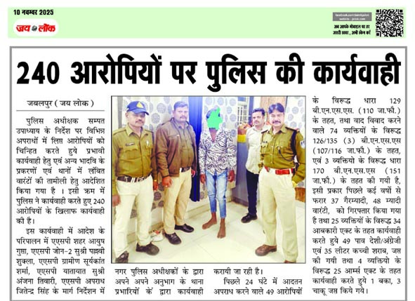 जबलपुर (जय लोक)। पुलिस अधीक्षक सम्पत उपाध्याय के निर्देश पर विभिन्न अपराधों में लिप्त आरोपियों को चिन्हित करते हुये प्रभावी कार्यवाही हेतु एवं अन्य भादवि के प्रकरणों एवं थानों में लंबित वारंटों की तामीली हेतु आदेशित किया गया है। इसी क्रम में पुलिस ने कार्यवाही करते हुए 240 आरोपियों के खिलाफ कार्यवाही की है।