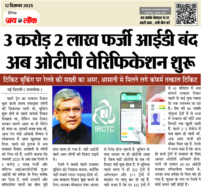 नई दिल्ली (जयलोक)। पहले ट्रेन का तत्काल टिकट बुक करते समय ज्यादातर लोगों की शिकायत रहती थी, बुकिंग शुरू होने से पहले कंफर्म टिकट दिखाता था, लेकिन जब टिकट बनकर सामने आता था तो वेटिंग हो जाता था. इसकी वजह क्या थी, आज रेल मंत्री अश्विनी वैष्णव ने लोकसभा में आज खुलासा कर दिया. पहले की तुलना में अब तत्काल टिकट आसानी से लोगों को मिल रहे हैं. उन्होंने बताया कि जनवरी 2025 से अब तक रेलवे ने 3 करोड़ 2 लाख फर्जी और संदिग्ध आईआरसीटीसी यूजर आईडी को हमेशा के लिए ब्लॉक कर दिया है. यानी दलालों और सॉफ्टवेयर वालों का खेल पूरी तरह खत्म हो गया है. यही आईडी वाले आम लोगों की टिकट उड़ाते थे।