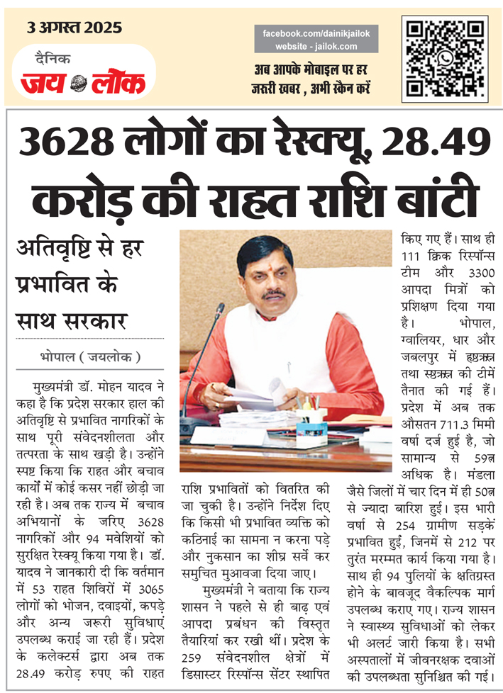 भोपाल (जयलोक)। मुख्यमंत्री डॉ. मोहन यादव ने कहा है कि प्रदेश सरकार हाल की अतिवृष्टि से प्रभावित नागरिकों के साथ पूरी संवेदनशीलता और तत्परता के साथ खड़ी है। उन्होंने स्पष्ट किया कि राहत और बचाव कार्यों में कोई कसर नहीं छोड़ी जा रही है। अब तक राज्य में बचाव अभियानों के जरिए 3628 नागरिकों और 94 मवेशियों को सुरक्षित रेस्क्यू किया गया है। डॉ. यादव ने जानकारी दी कि वर्तमान में 53 राहत शिविरों में 3065 लोगों को भोजन, दवाइयों, कपड़े और अन्य जरूरी सुविधाएं उपलब्ध कराई जा रही हैं। प्रदेश के कलेक्टर्स द्वारा अब तक 28.49 करोड़ रुपए की राहत राशि प्रभावितों को वितरित की जा चुकी है। उन्होंने निर्देश दिए कि किसी भी प्रभावित व्यक्ति को कठिनाई का सामना न करना पड़े और नुकसान का शीघ्र सर्वे कर समुचित मुआवजा दिया जाए।