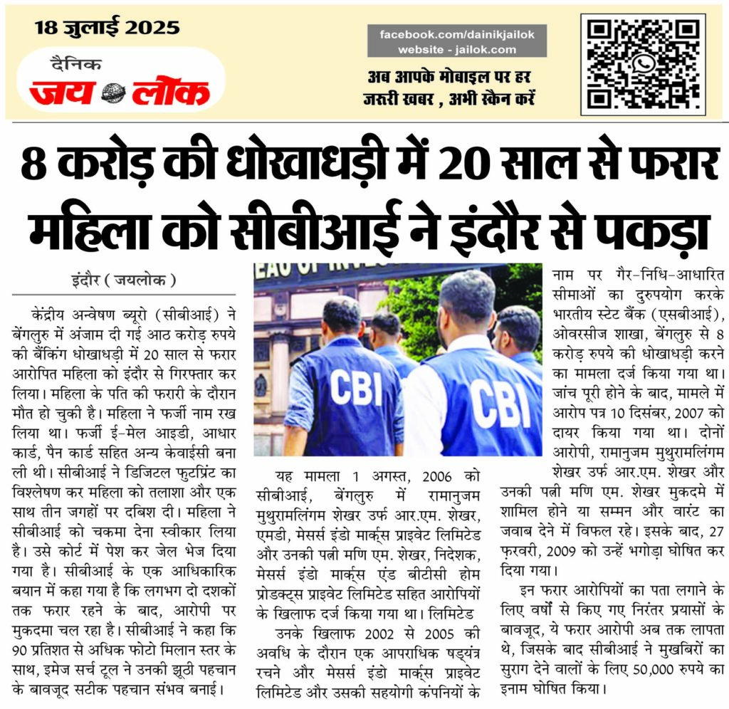 8 करोड़ की धोखाधड़ी में 20 साल से फरार महिला को सीबीआई ने इंदौर से पकड़ा