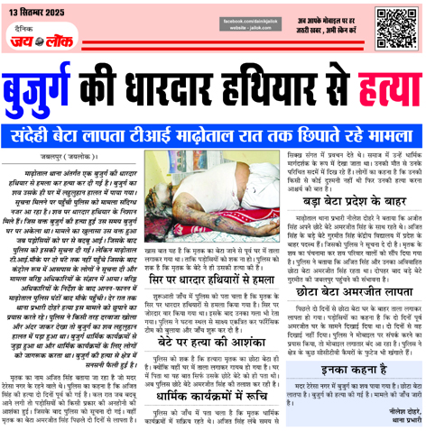 धारदार हथियार से बुजुर्ग की हत्या, संंदेही बेटा लापता टीआई माढ़ोताल रात तक छिपाते रहे मामला