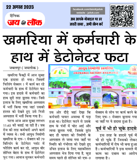 खमरिया में कर्मचारी के हाथ में डेटोनेटर फटा