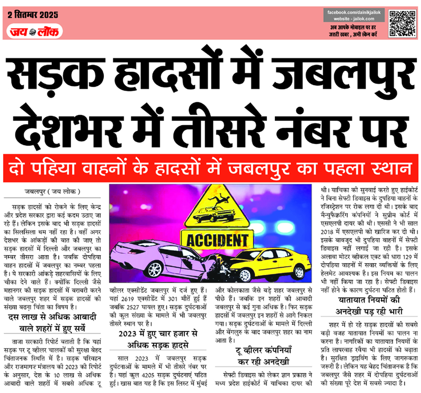 सडक़ हादसों में जबलपुर देशभर में तीसरे नंबर पर
