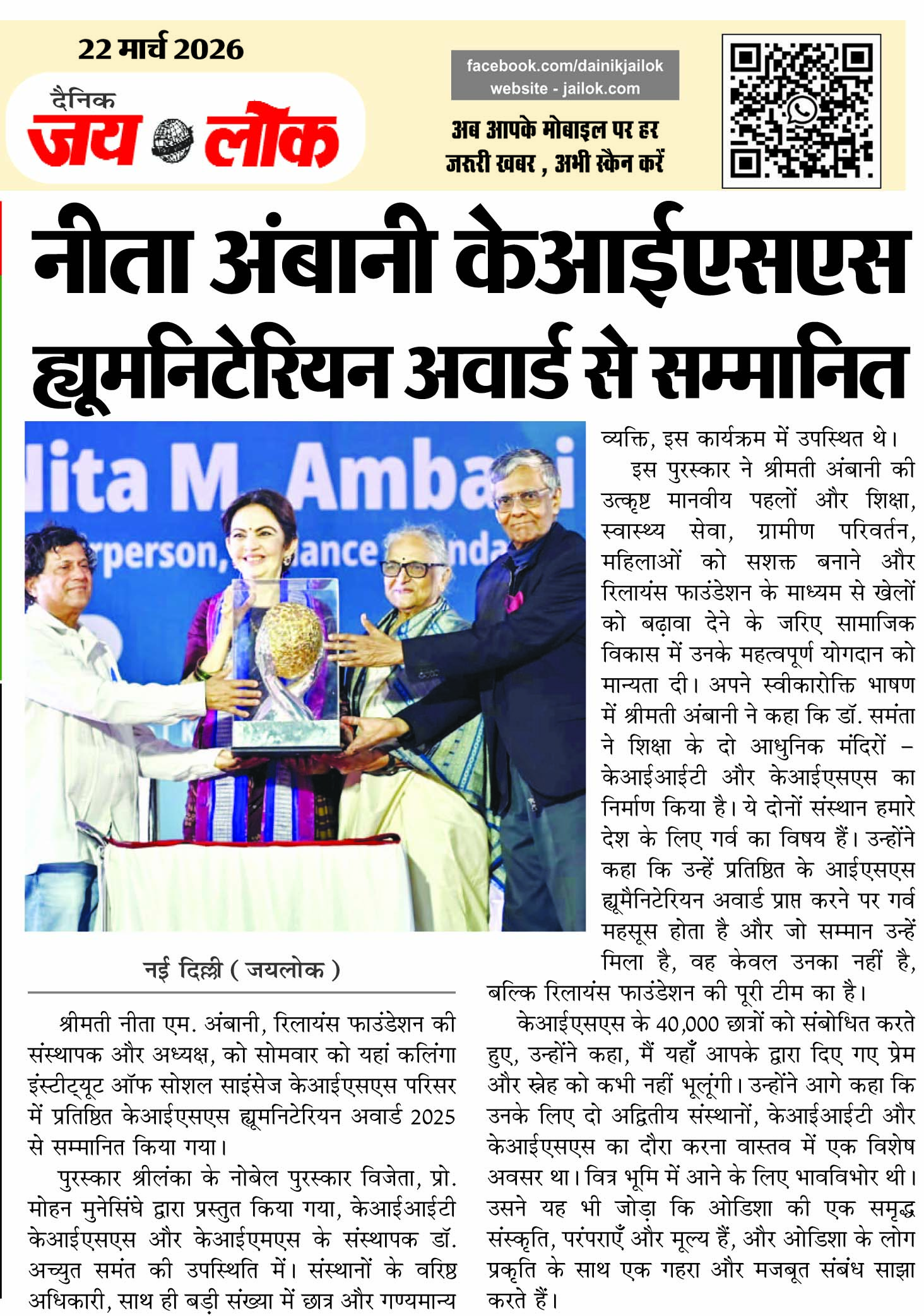 नीता अंबानी केआईएसएस ह्यूमनिटेरियन अवार्ड से सम्मानित