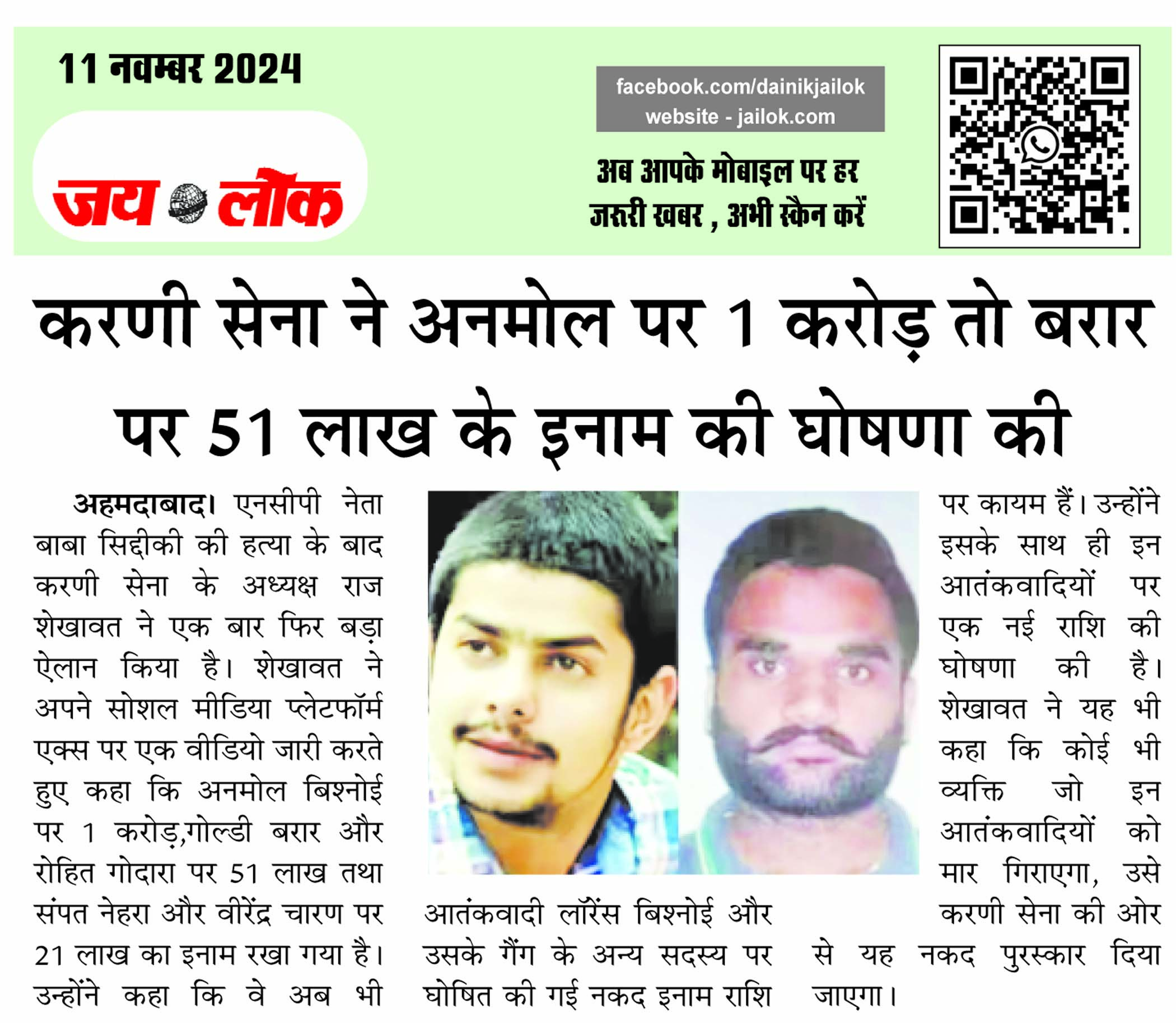 करणी सेना ने अनमोल पर 1 करोड़ तो बरार पर 51 लाख के इनाम की घोषणा की