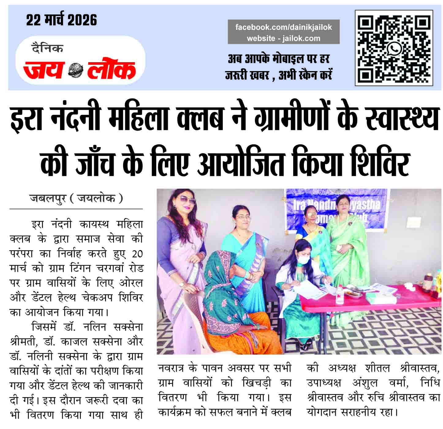 जबलपुर (जयलोक)। इरा नंदनी कायस्थ महिला क्लब के द्वारा समाज सेवा की परंपरा का निर्वाह करते हुए 20 मार्च को ग्राम